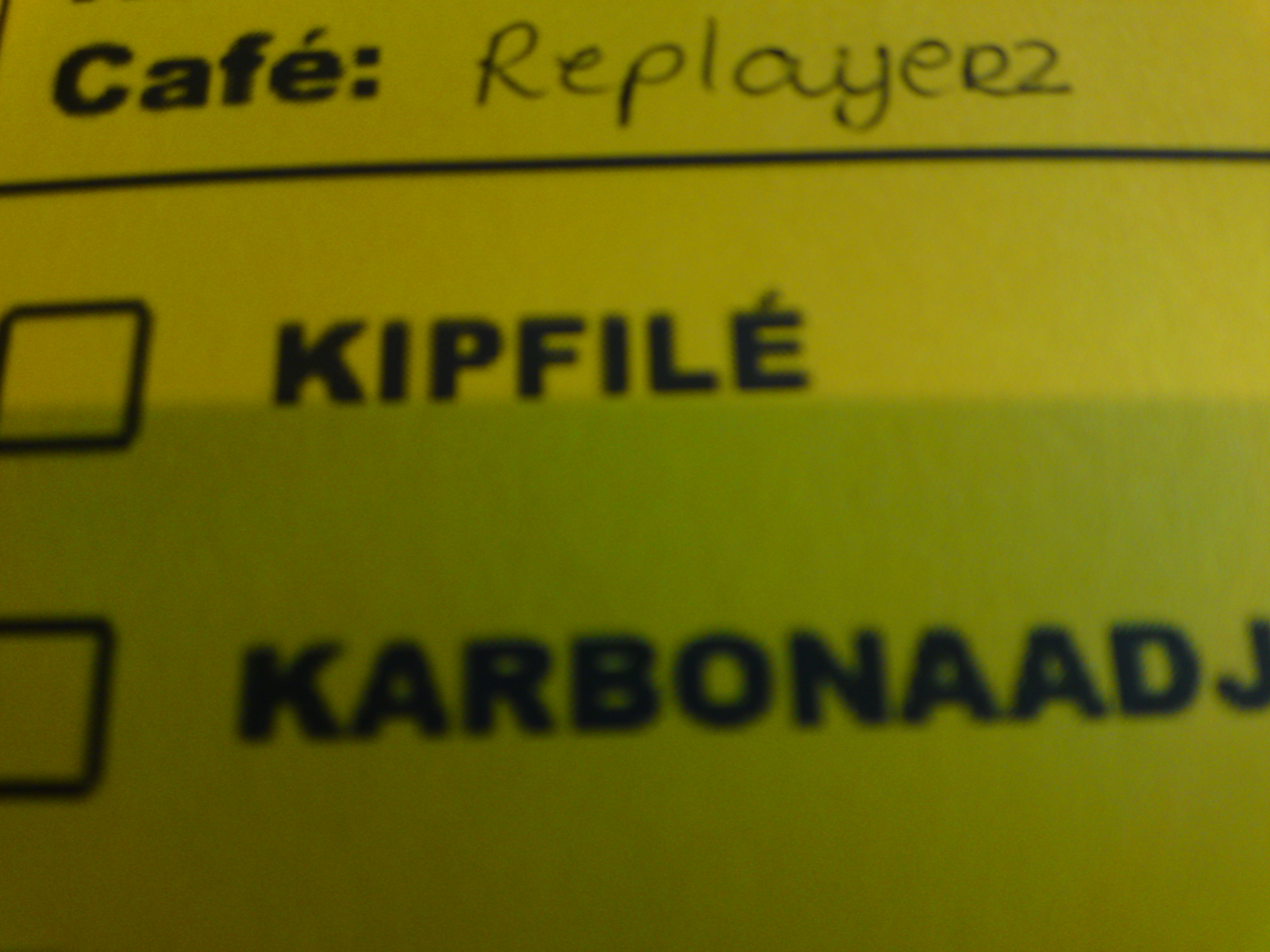 rest van ons staat dus keurig in de rij met ons bordje en servetje. Onze andere hand stevig om een miniscuul geel blaadje geklemd. Enkel hamburgers eten zit er niet in vandaag. Want op het blaadje staan vijf soorten vlees met vijf afvinkvakjes ervoor. En afgevinkt wordt er, bij het leven, want het moet natuurlijk wel eerlijk blijven.